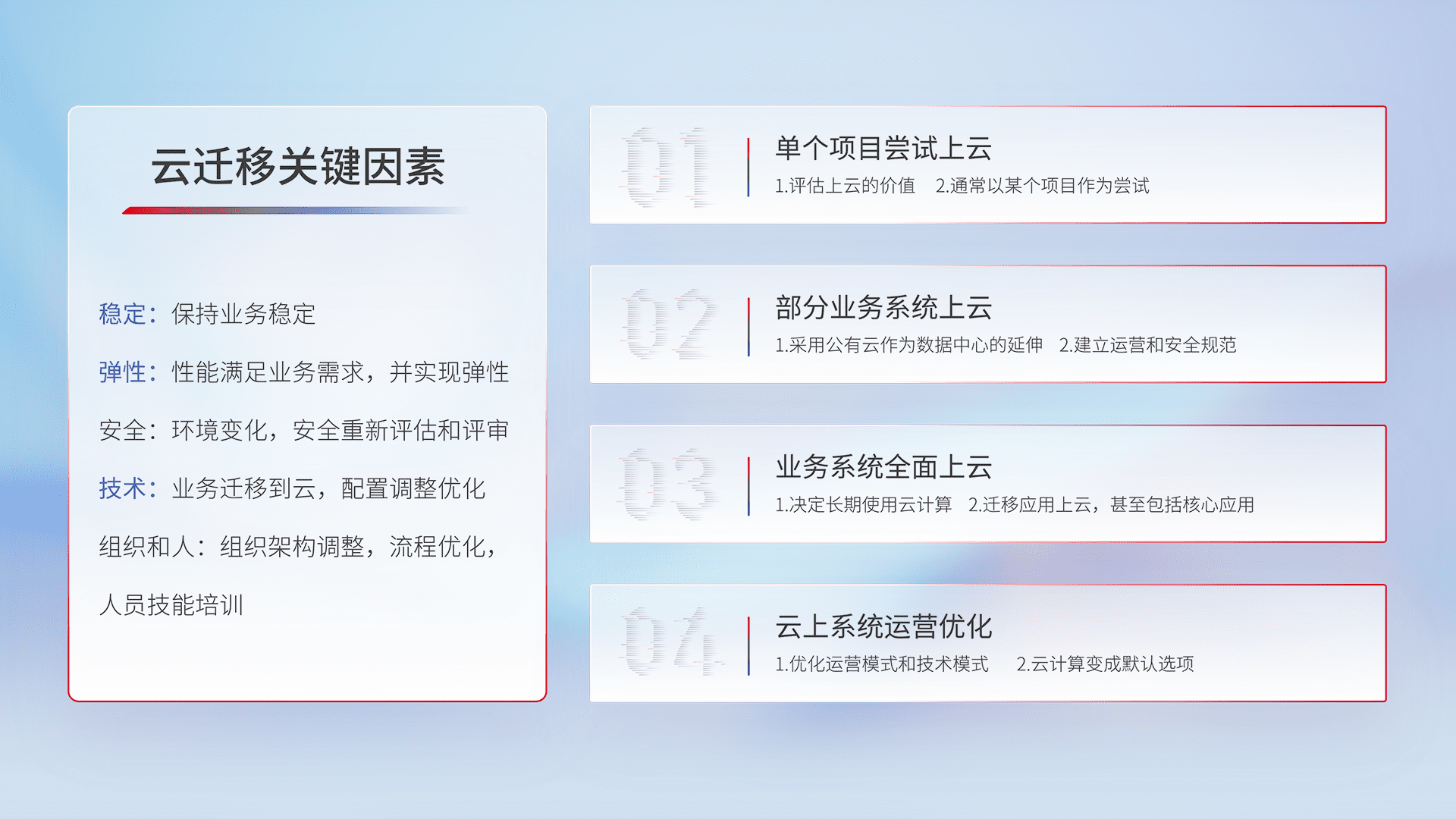 结合实际业务,,从规划设计、、、、云平台选型、、云原生改造、、数据迁移、、、集成交付,,,,迁移全过程为客户识别最佳上云路径,,做好风险识别管理,,,设计网络架构、、、、身份权限、、安全审计合规、、、、操作审计、、日志审计、、监控告警策略、、、多站点容灾设计等,,对云上基础设施进行整体规划,,,,提升IT治理水平,,,,以满足弹性、、、、高可用、、、、高性能的需求。。